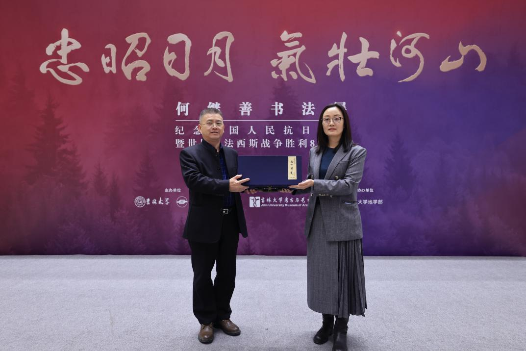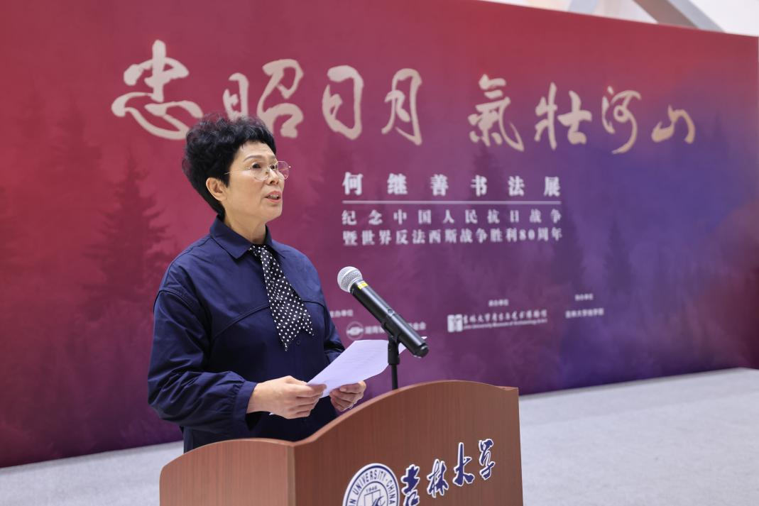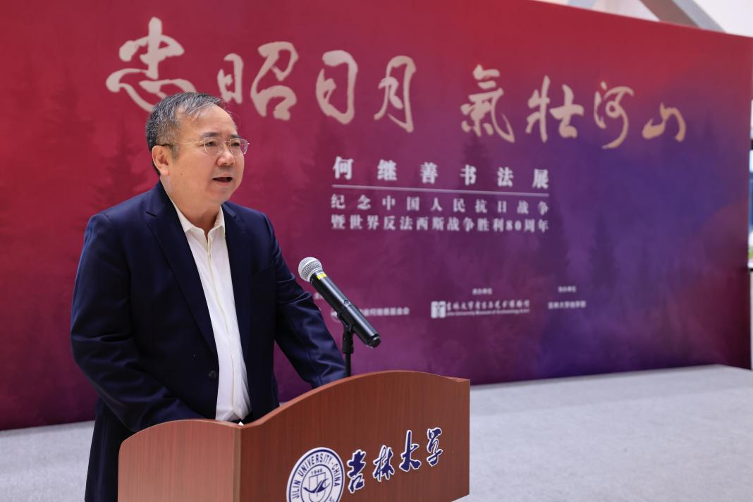 吉林大学党委副书记韩喜平教授在致辞中表示,何继善院士不仅是著名的地球物理学家,更是将科学精神与人文素养结合的典范。其书法作品笔力遒劲、气韵生动,既是对传统书法艺术的深刻诠释,更是对伟大抗战精神的崇高礼赞,每一幅都凝聚着他对历史的深刻思考、对先烈的无限敬仰和对祖国的深沉热爱。此次展览,在中国人民抗日战争暨世界反法西斯战争胜利80周年这个特殊的年份,在长春这个曾经历过烽火硝烟洗礼的英雄土地,以书法为纽带回溯,更能够贴近历史,传承民族精神,对于引导更多人尤其是青年一代勿忘国耻、铭记历史、砥砺报国之志具有重要的教育意义。