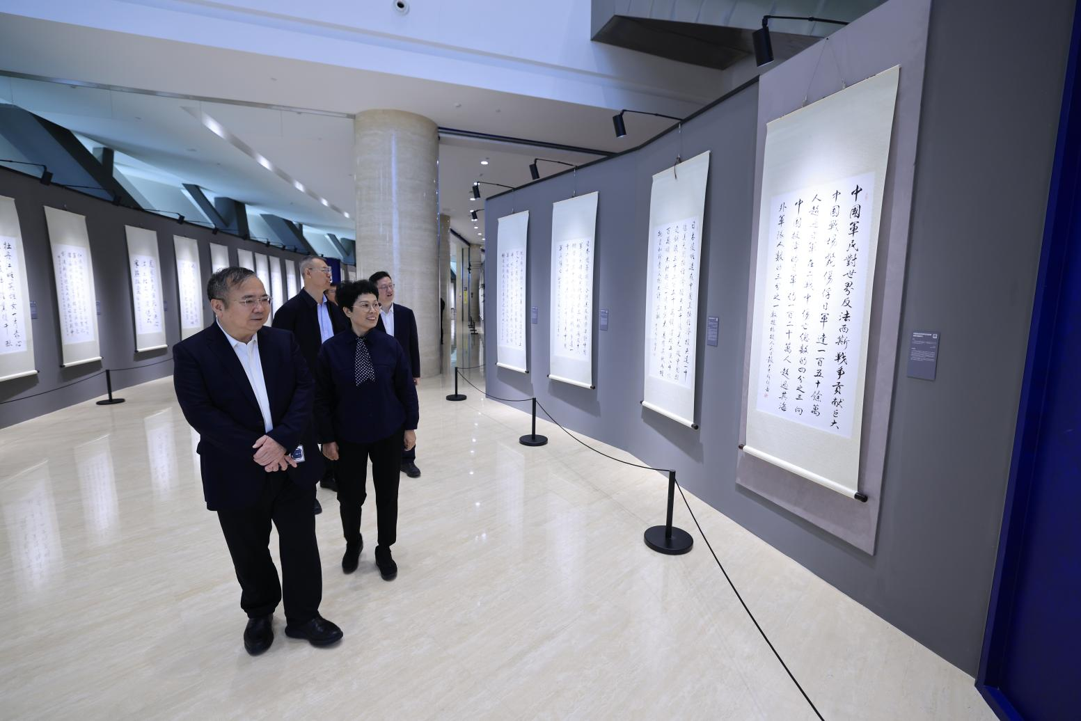 仪式结束后,与会领导、嘉宾与师生移步展厅观展。一幅幅气韵生动的书法作品,既有抗战史诗,也有家国格言,笔走龙蛇间尽显忠贞之气,墨韵流转中饱含赤子之情。观众驻足凝神,细细品味其中蕴含的浩然正气与爱国深情,无不为这深厚的艺术学养与炽热的家国情怀所感染。
